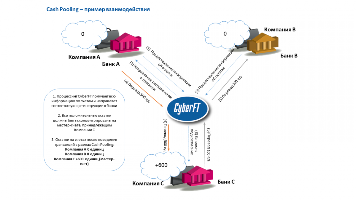 Таким образом роль расчетного центра для Cash Pooling, которую обычно играет автоматизированная банковская система внутри одного банка, займет Процессинг CyberFT. Такой подход предоставляет широкие возможности корпоративным клиентам для организации автоматических межбанковских переводов в рамках холдинга или группы компаний.