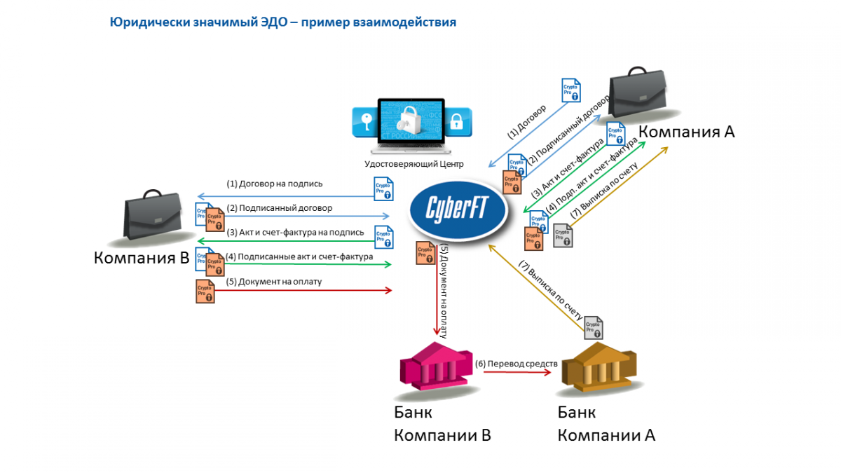 Компании могут взаимодействовать через CyberFT не только с банками, но и друг с другом, организовав электронный документооборот юридически значимых документов. Например, два участника, установив между собой доверительные отношения, могут обмениваться в электронной форме контрактами, счетами (инвойсами) и другой информацией, необходимой для ведения бизнеса.