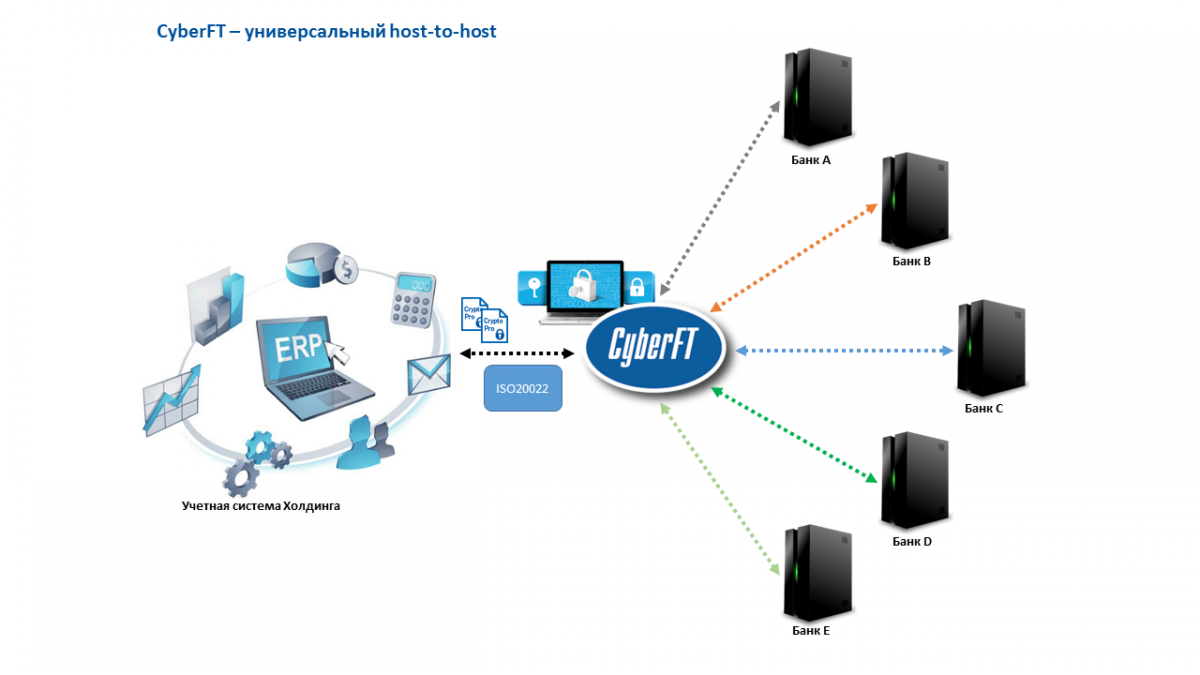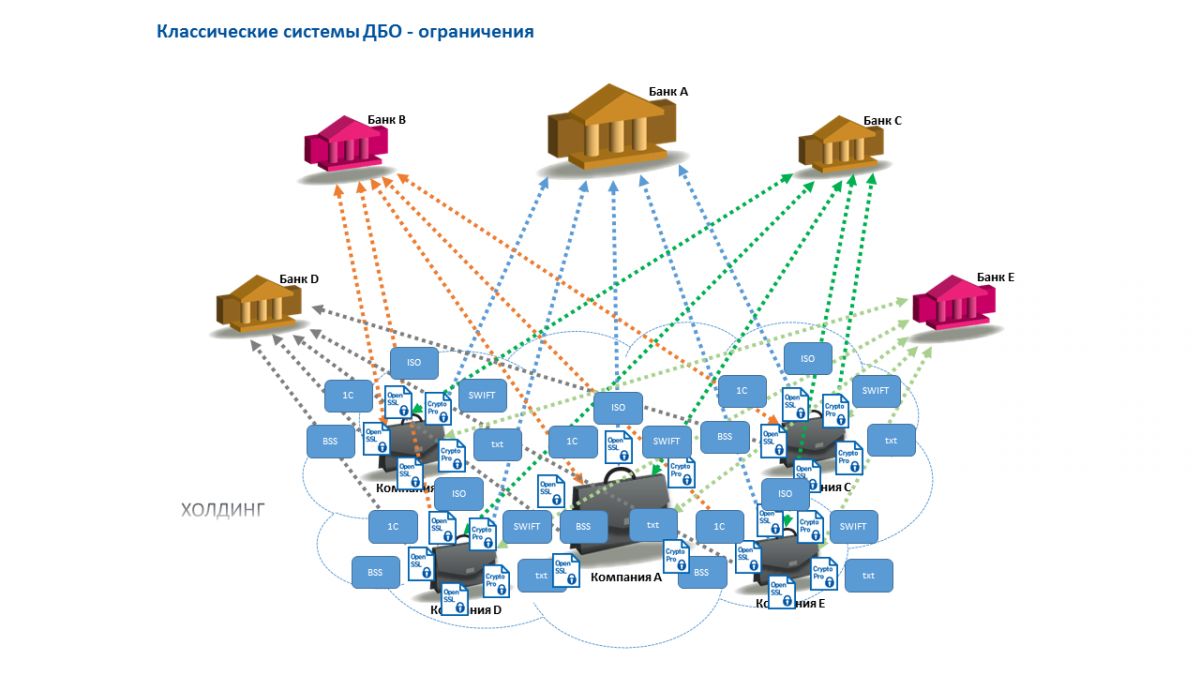 И даже использование прямой интеграции учетной системы клиента с банком (Host-to-Host) полностью не решает задачу, так как каждый банк предлагает клиенту свой канал обмена данными, определенные форматы и определенные средства криптографической защиты информации.